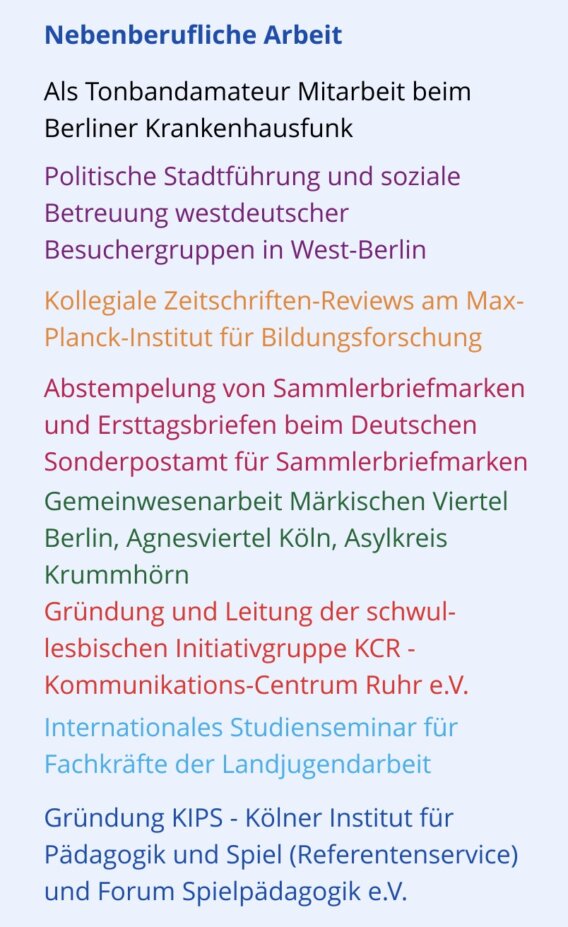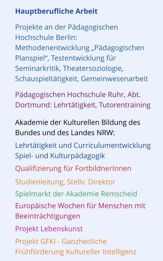 Hier unten Zusammenfassungen der haupt- und nebenberuflichen sowie publizistischen Tätigkeiten: