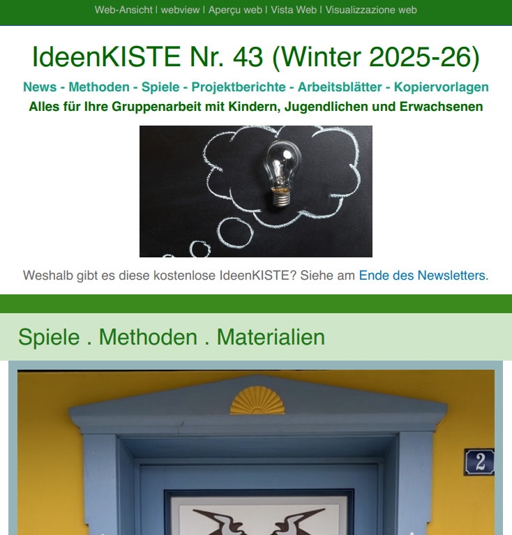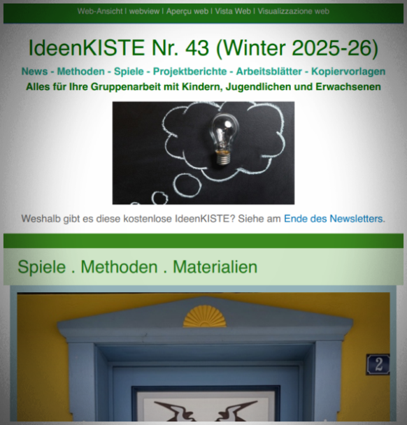 Mitte 2024 hat der Friedrich Verlag mit dem 50. Jahrgang aus ökonomischen Gründen das Erscheinen der Zeitschrift eingestellt. Ich gebe als kleine Fortsetzung zusammen mit Kollegen einen vierteljährlichen kostenlosen Newsletter heraus: dieses Online-Magazin bringt News und auch längere Artikel für die sozialpädagogische Gruppenarbeit und setzt auch die Tradition des Spiels zum Sofortspielen (downloadbare Pdf-Dateien) fort.