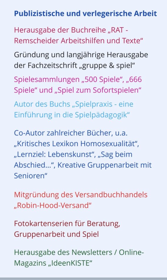 - Autor der "Spiele zum Sofortspielen", (1982 - 2024 als Beilage in der Zeitschrift "gruppe & spiel", ab Herbst 2024 im Online-Magazin "IdeenKISTE")